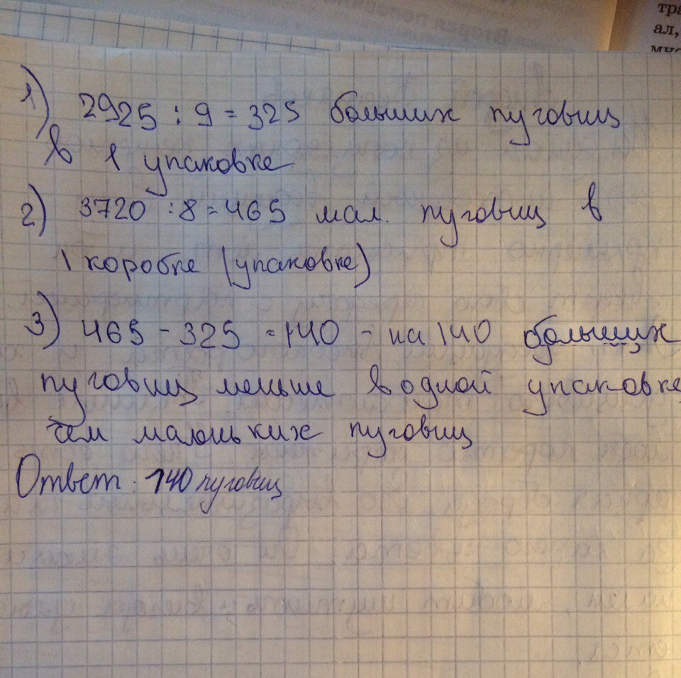 Вот задача В 9 упаковках-2925 больших пуговиц,а в 8 упаковках-3720 маленьких пуговиц.Узнай,на сколько меньше в одной упаковке больших пуговиц,чем меленьких пожалуйста решите и лутшие фото как сможете?