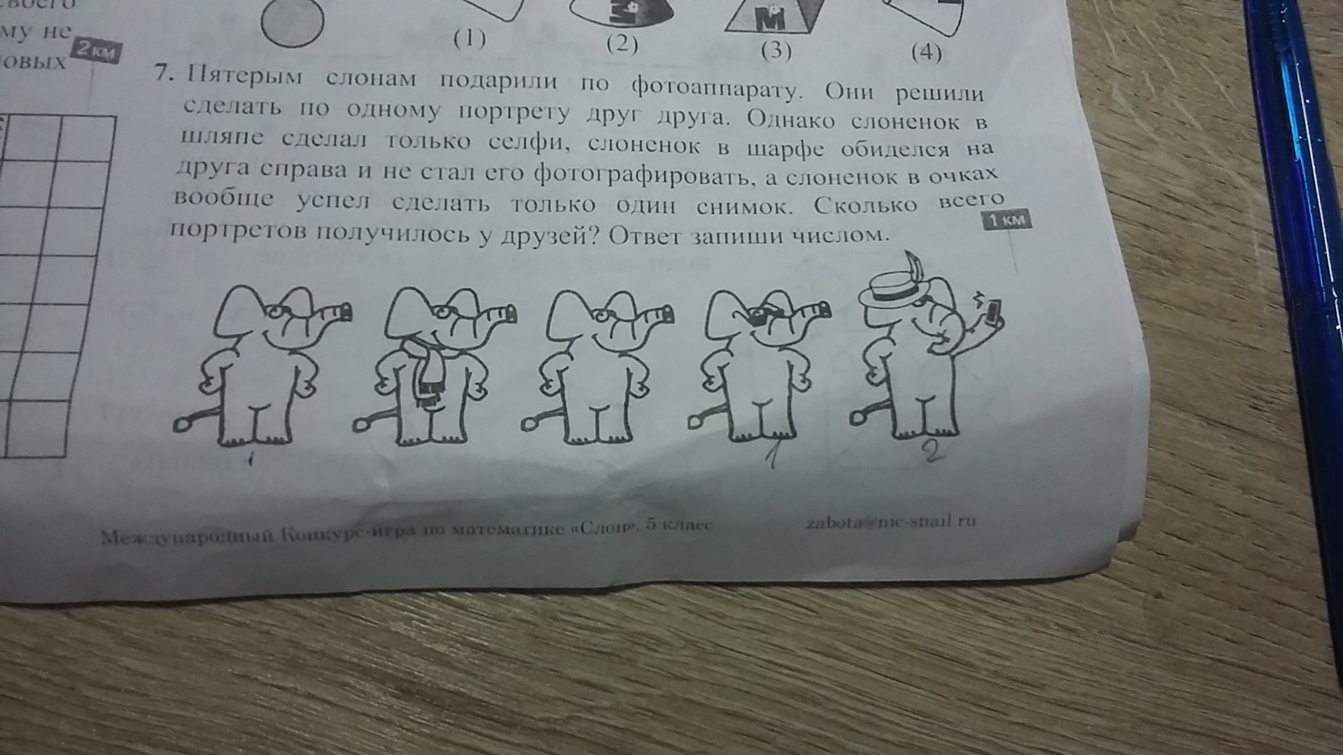 кажется ответ 2 снимок. т к, сфоткался только слоненок в очках. а слоненок обиженный на друга, мог сфотографироваться, только не включил в портрет слоненка справа!