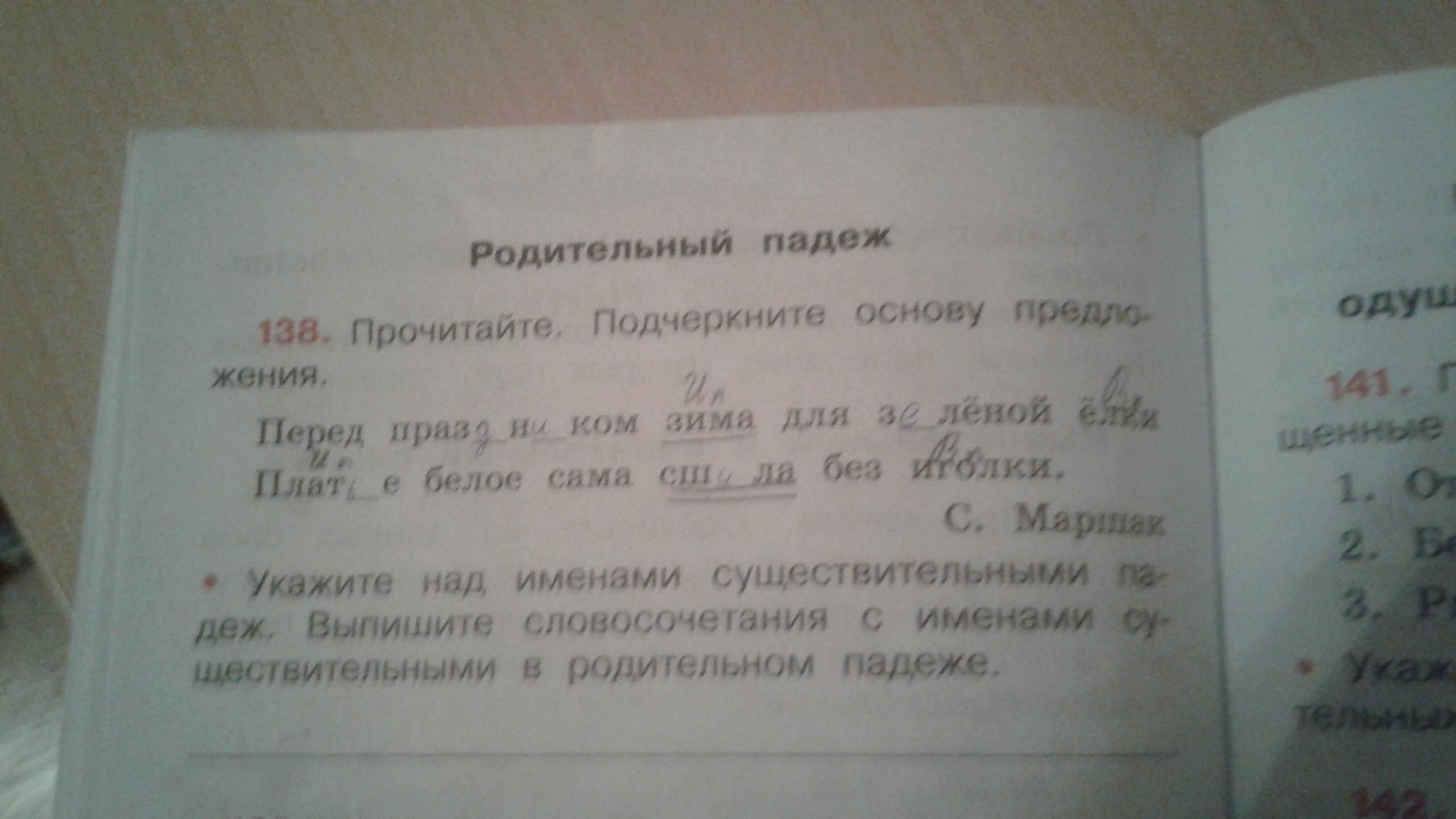 Основа: зима сшила,праздником Т.п.,зимаИ.п.,ёлки Р.п.,дальше правильно ,иголки Р.п.