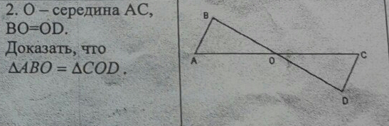 Т.к O - середина AC, то AO = OC. OB = OD по условию задачи. Угол AOB = углу DOC (как вертикальные). Значит треугольник ABO = треугольнику COD по двум сторонам и углу между ними (AO = OC, OB = OD и угол AOB = углу DOC).