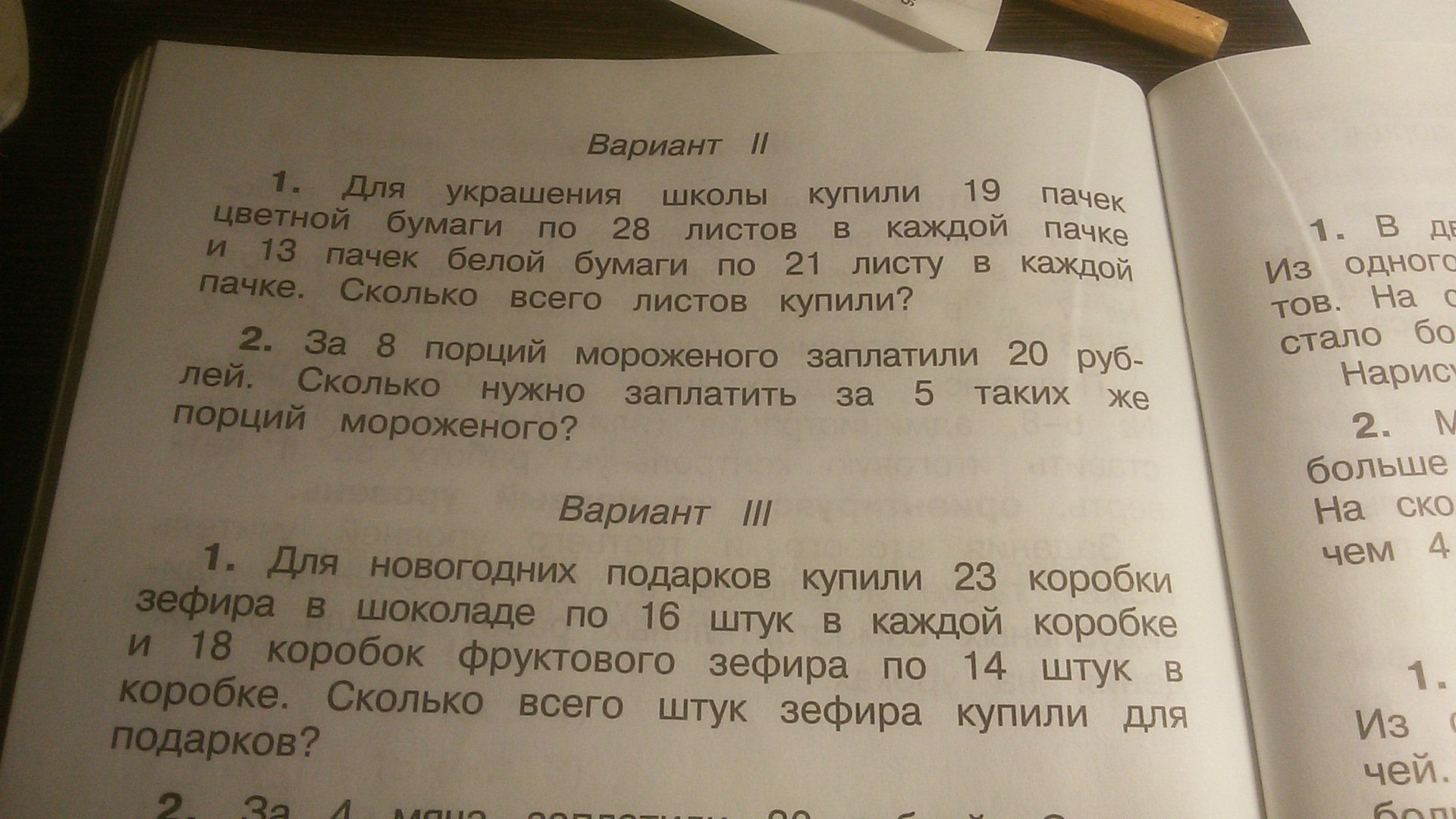 1-я задача. 1) 28*19=532(всего цветной бумаги) 2) 13*21=273(всего белой бумаги) 3) 273+532=805(всего) 2-я задача. 1) 20:8=2,5(цена одной порции) 2) 2,5*5=12,5(цена за 5-ть порций)