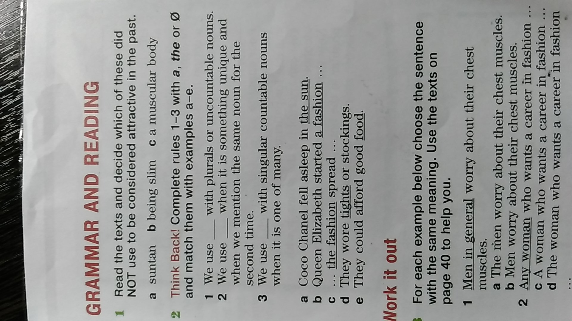 1) нулевой артикль - d, e 2) the - a, c 3) a - b