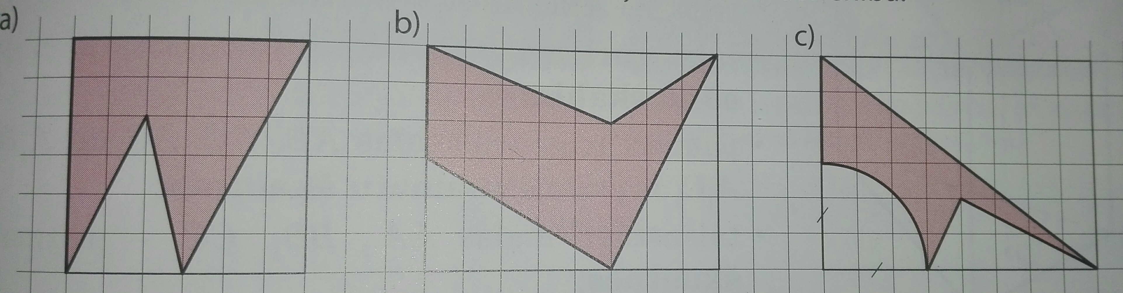 а) 14 целых квадратов+ 14 нецелых х 1/2 = 21 кв.см. Точно так же по аналогии считаем остальные. Это решение палеткой.