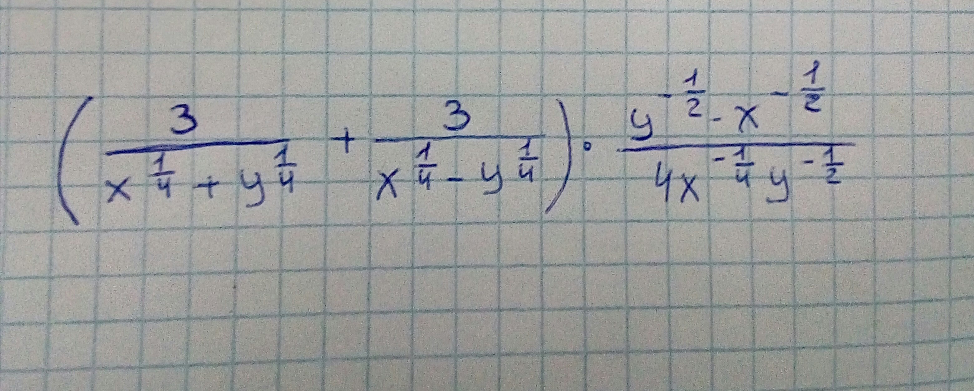 left ( frac{3}{x^{1/4}+y^{1/4}} + frac{3}{x^{1/4}-y^{1/4}} right )cdot  frac{y^{-1/2}-x^{-1/2}}{4x^{-1/4}y^{-1/2}} = frac{3cdot 2x^{1/4}}{x^{1/2}-y^{1/2}} cdot  frac{x^{1/4}y^{1/4}(x^{1/2}-y^{1/2})}{4cdot x^{1/2}y^{1/2}} =\\= frac{3cdot x^{1/2}y^{1/4}}{2x^{1/2}y^{1/2}} = frac{3}{2y^{1/4}} =1,5cdot y^{-frac{1}{4}}