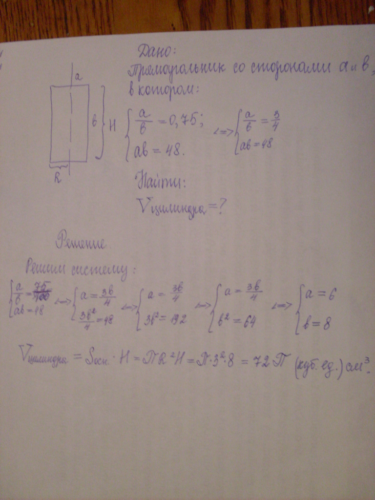 Отношение длин сторон прямоугольника равно 0,75 ,а его площадь-48 см^2.Найдите объем тела,полученного при вращении прямоугольника вокруг его оси симметрии.