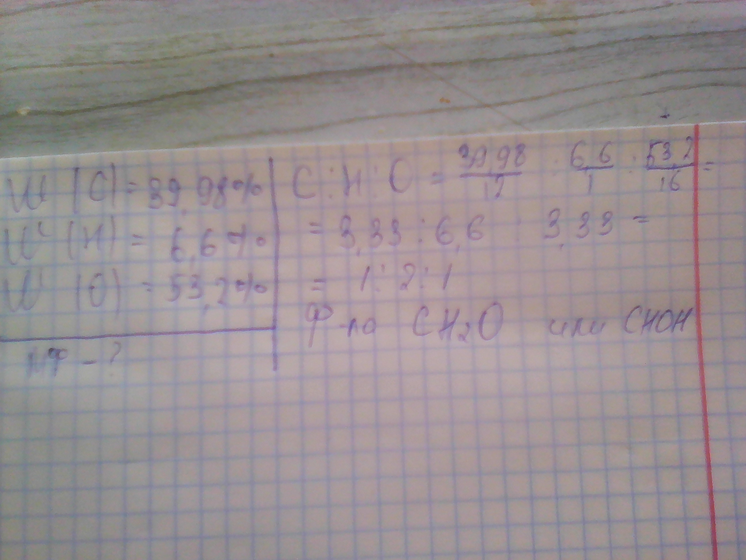 Выведите молекулярную формулу вещества, если известно, что массовая доля углерода- 39,98%, массовая доля водорода- 6,6%, массовая доля кислорода – 53,2%.