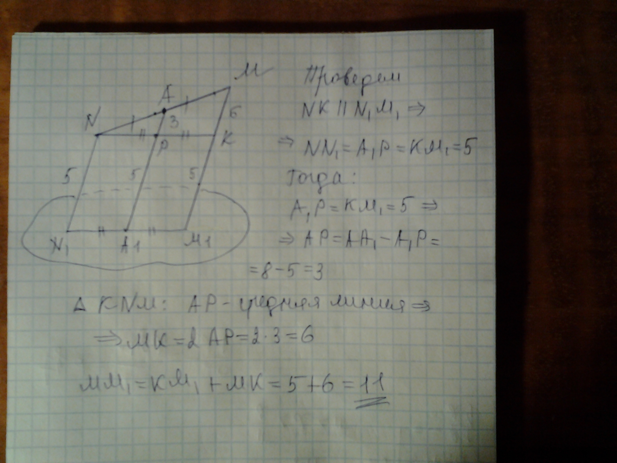 ДОПОМОЖІТЬ!!! ДУЖЕ ТЕРМІНОВО!!! Відрізок MN не перетинає площину альфа . Точка А-середина MN.через точки M,N,A проведено паралельні прямі , які перетинають площину альфа в точках M1,N1,A1 відповідно. Знайдіть MM1, якщо AA1=8cm, NN1=5cm (потрібне саме пояснення)