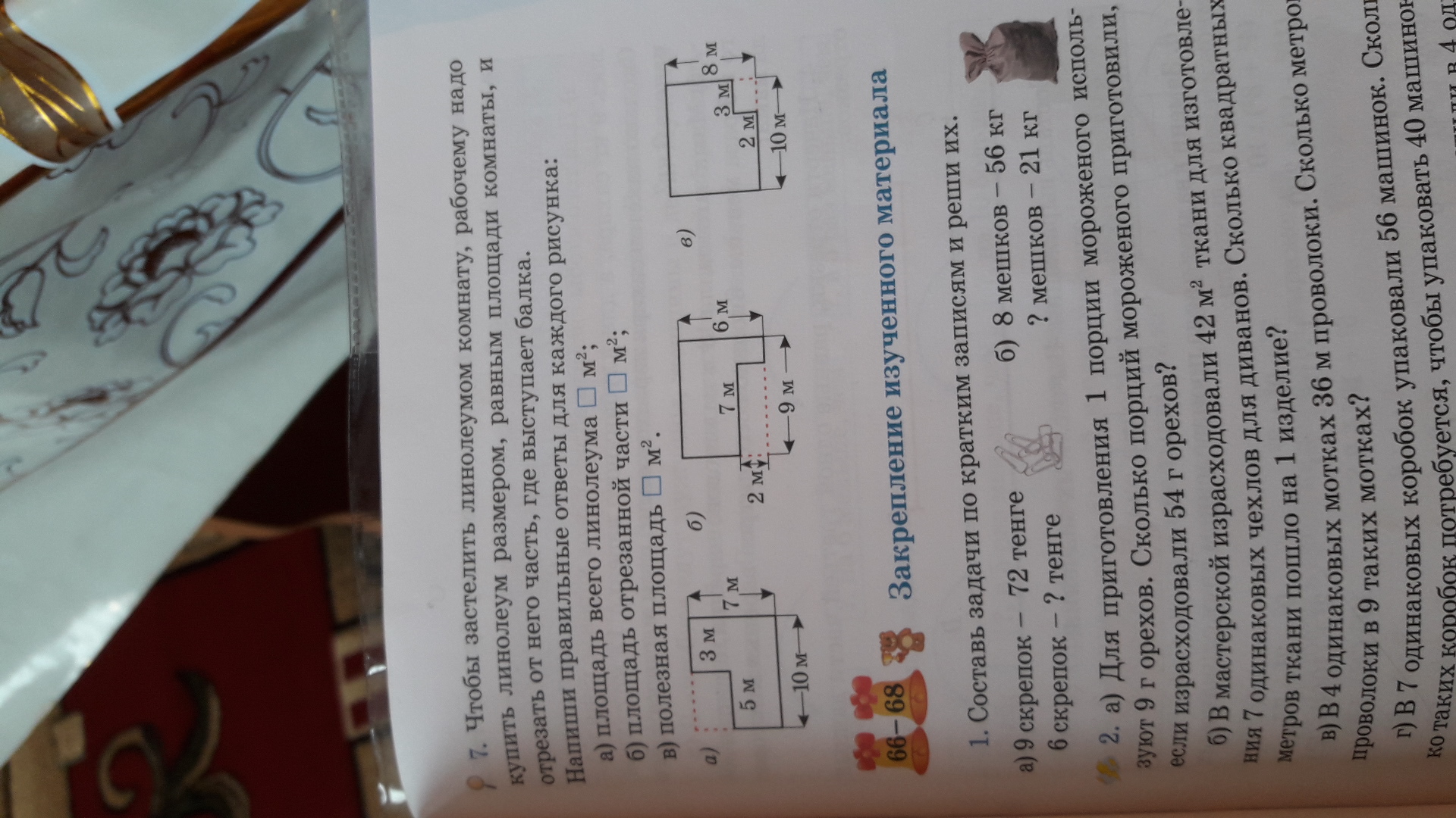 1) 7 * 10 = 70 (кв.м) - площадь всего линолеума