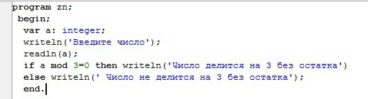 program zn; begin; var a: integer; writeln('Введите число'); readln(a); if a mod 3=0 then writeln('Число делится на 3 без остатка') else writeln(' Число не делится на 3 без остатка'); end.