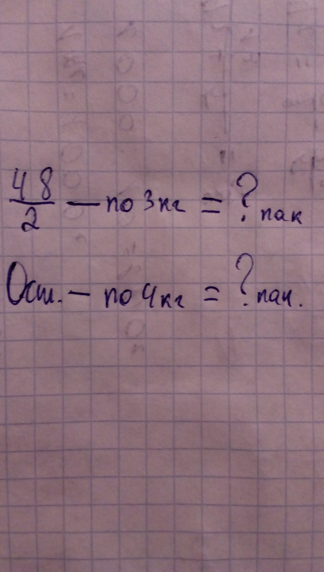Половину 48 кг сахара расфасовали в пакеты по 3 кг,остальную часть -в пакеты по 4 кг.Во сколько пакетов расфасовали сахар? краткое условие пожалуйста,решение не надо!