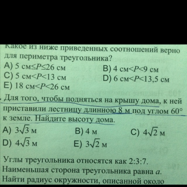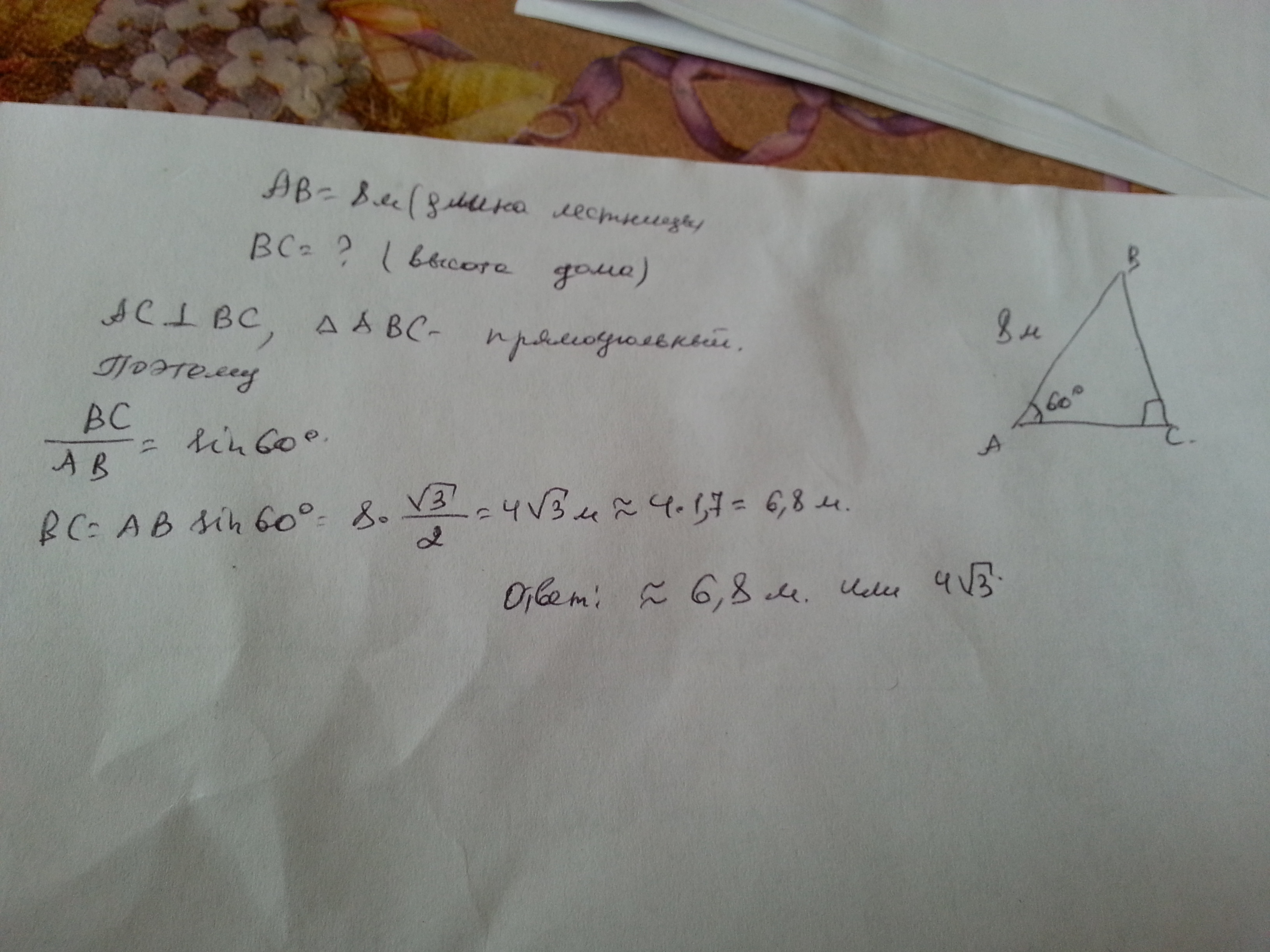 Для того ,чтобы подняться на крышу дома,к ней приставили лестницу длинною 8м под угол 60 градусов к земле.Найдите высоту дома