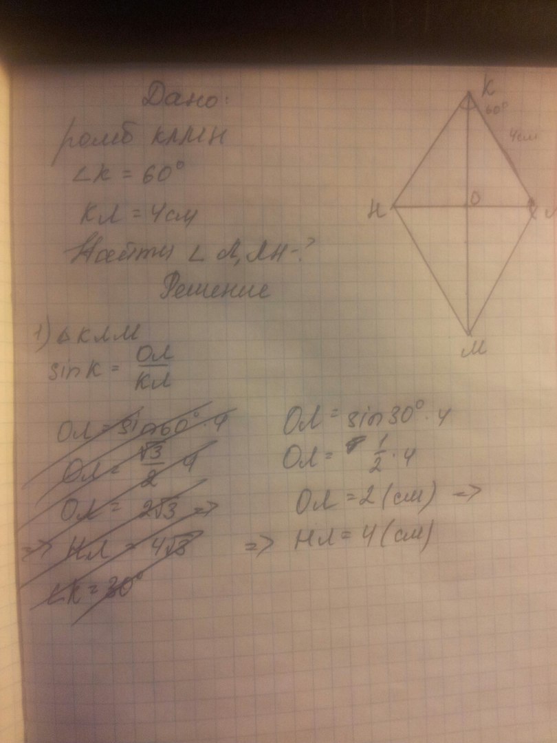 Постройте ромб КЛМН, если КЛ=4 см, угол К=60 градусов. Измерьте длину отрезка ЛН и величину угла Л