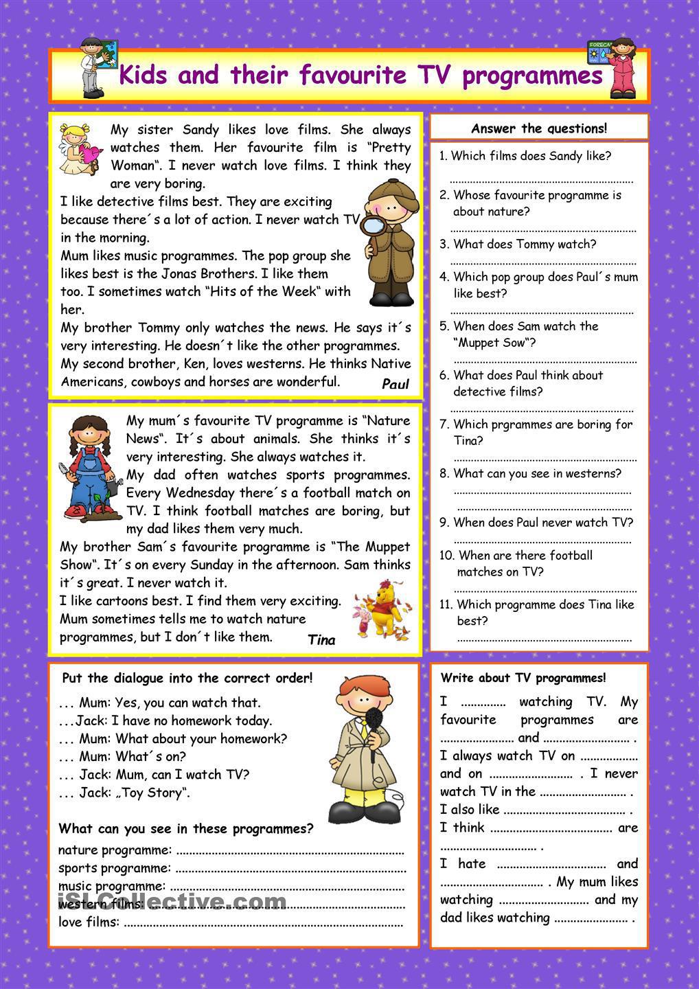 1)Sandy likes love films. 2) Paul's mother prefers music programmes . 3) Tommy only watches the news. 4)Paul's mum likes best The Jonas Brothers. 5) Sam watches The Muppet Show every Sunday in the afternoon.6) Paul thinks the detective films are very exciting.7) Tina thinks the football matches are boring. 8) In westerns we can see wonderful stories about cowboys, Native Americans and horses.9) Paul never watches TV in the mornings 10) Every Wednesday there are football matches on TV. 11) Tina's favourite programme is Nature News.
