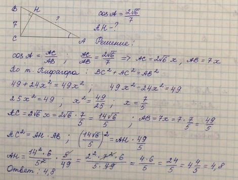 В треугольнике ABC угол C равен 90°, CH — высота, BC=7, cosA = 2√6/7 . Найдите AH.