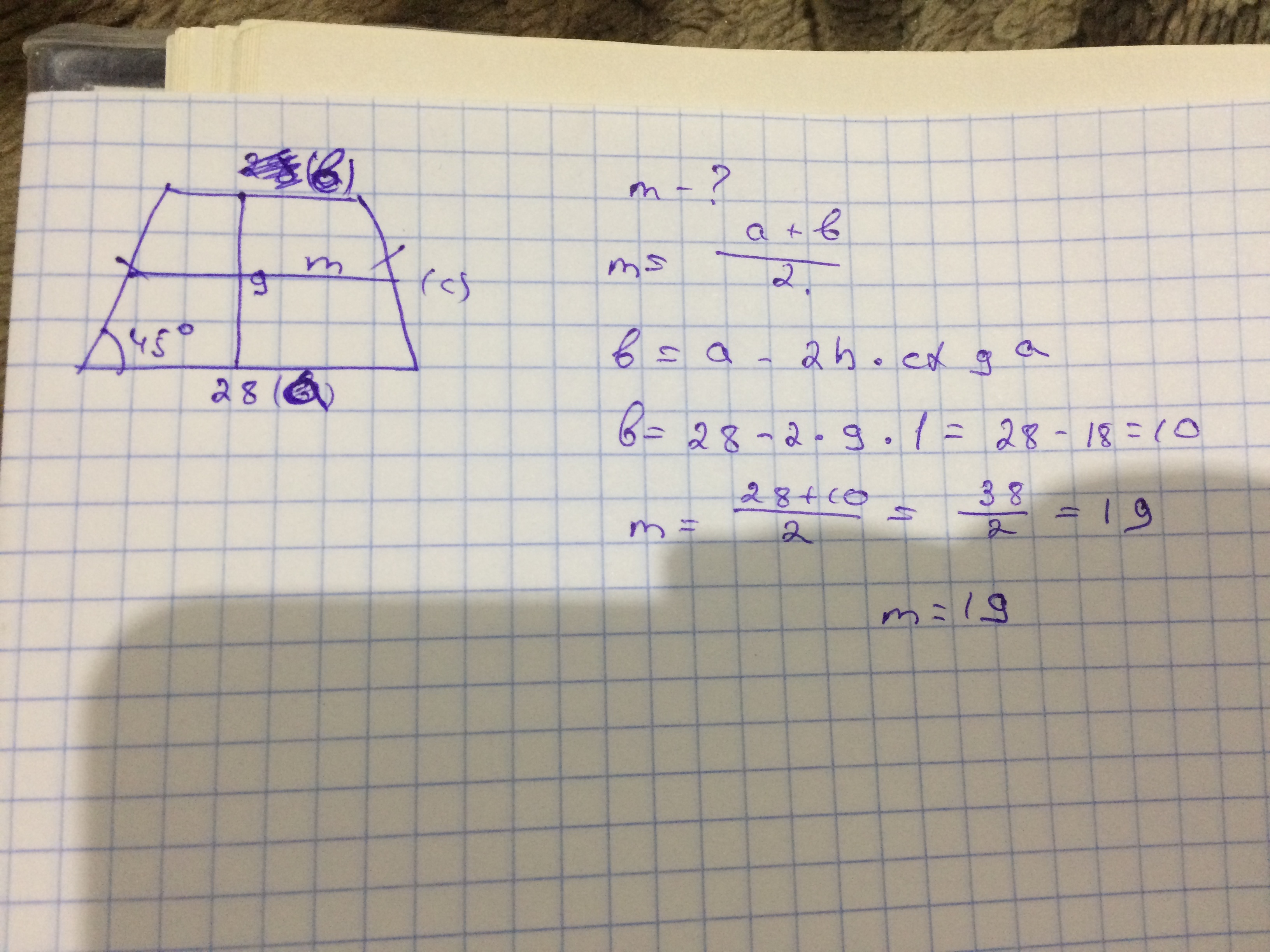 Решите пожалуйста. Ревнобедреной трапециибольшая основа равна 28см а высота равнв 9см гострый кут =45°. Найдите длину середней линии
