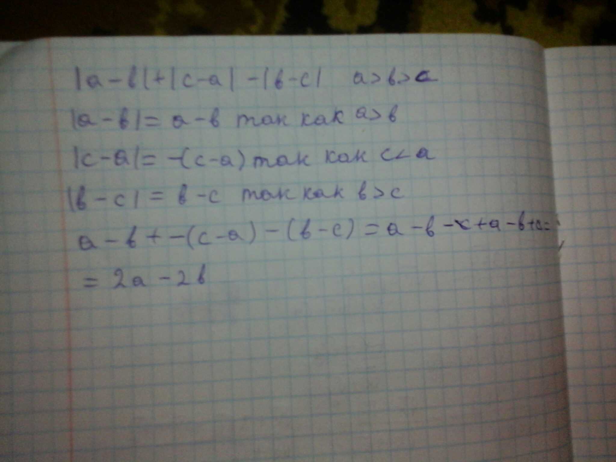 |а-b|+|c-a|-|b-c| сократите если а>b>c. прошу не путать со скобками.это Модули. и Не забудьте оббяснить что как и почему.