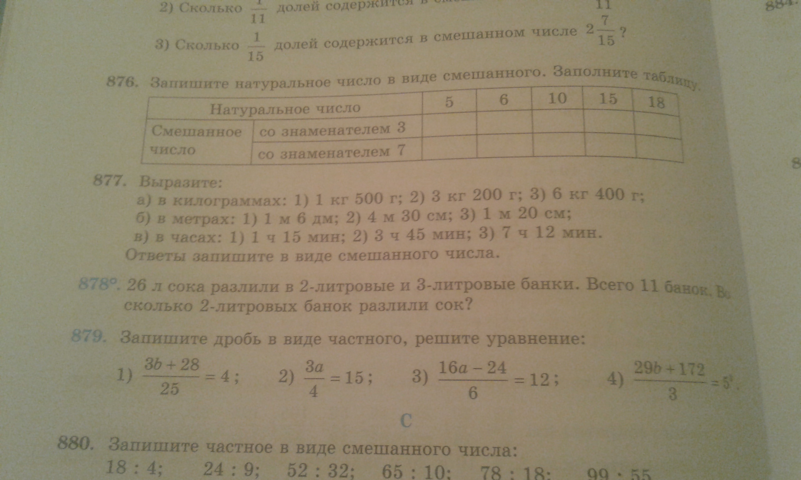 №878 Это олимпиадная задача типа головы и ноги. Решение: Допустим, что все бидоны - 2-хлитровые. Тогда - они вместят (2*11=22) литра молока. Но т.к. у нас 26 литров, нам не хватает (26-22=4) литра. Эти 4 литра - и и есть 3-хлитровые банки. А т.к. не хватает 4 литра - всего 4 3-хлитровые банки, ибо: 3-хлитровая банка=2-хлитровая+1 литр. Вывод (ответ): 4 трёхлитровые и (11-4=7) 7 двухлитровых банки.