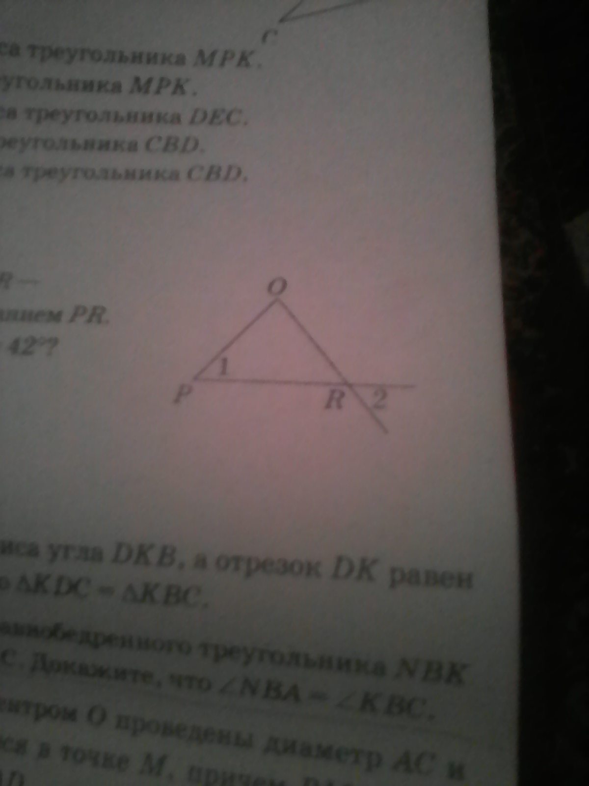 помогите!!! треугольник POR равнобедренный с основанием PR чему равен угол 1 если угол 2=42градусам