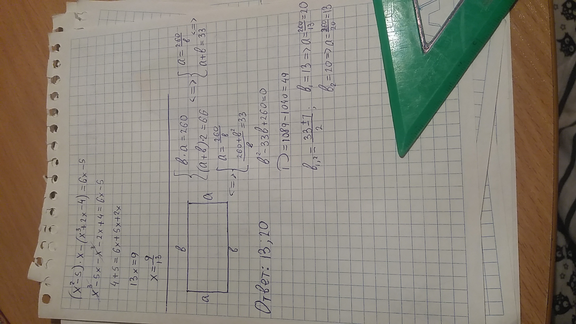 Площадь прямоугольника равна 260 квадратных сантиметров, а его периметр равен 66 см. Найдите строев прямоугольника