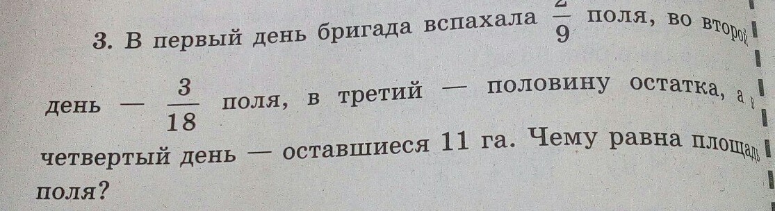 Площадь поля вроде бы равна 14,5г так как остается 11г, то 3.5(2/9 : 3/18) вот и получается 11 + 3.5= 14.5