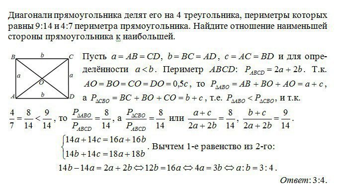 Диагонали прямоугольника делят его на 4 треугольника,периметры которого равны 914 и 47 периметра прямоугольника. найдите отношение наименьшей стороны прямоугольника к наибольшей.