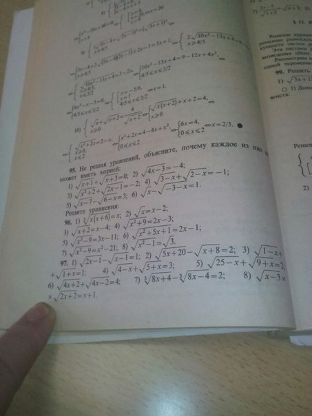 Обе части равенства в куб и все перенесём влево, получим х в квадрате+6х-х в Кубе=0х вынесем за скобку х(-х в квадрате+х-6)=0; х=0 и квадратное уравнение хв квадрате-х-6=0 по теореме Виета х=-3 и х=2. 2) х-2>или равно(нестрогое неравенство) 2; х>=2; обе части в квадрат х=х^2-4х+4; х^2-5х+4=0 по т Виета х=1,но он не входит в ОДЗ х>=2. И х=4 ответ 4. 3)х-4>=0; х>=4; обе части в квадрат х+2=х^2-8х+16,все перенести вправо х^2-9х+14=0;по т Виета х=2,но он не удовлетворяет ОДЗ:х>=4 и х=7 ответ 7. 4) 2х-3>=3; х>=1,5. Обе части в квадрат х^2+9=4х^2-12х+9; 9 в обеих частях зачеркиваем,они взаимно уничтожаются, и3х^2-12х=0; 3х(х-4)=0 х=0, но не подходит к х>=1,5. Х-4=0 х=4 ответ 4