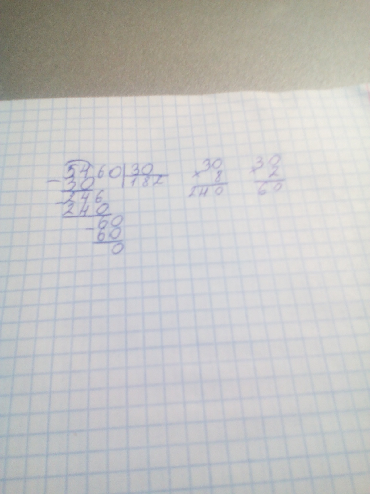 мы 5 не можем : на 30 поэтому берём 54 если мы 30×2 то получится 60, но мы же не можем 54-60, то надо 54-30 или 30×1.Затем у нас остаток 24 сносим 6,получается 246 пробуем 30×8 получается 240.Затем получается 6 сносим 0 получается 60 и мы 30×2 получается 60. =182