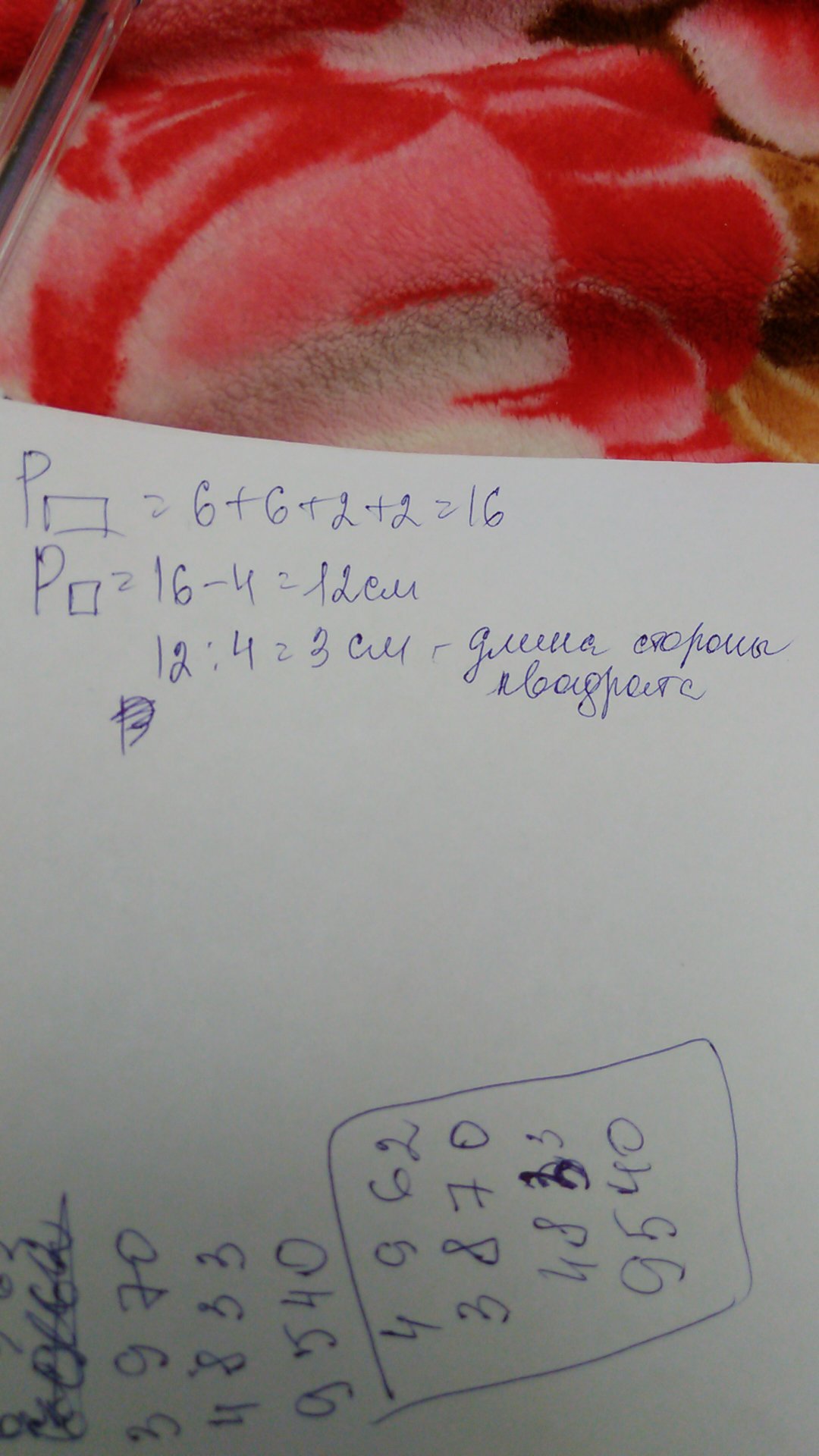 периметр квадрата меньше периметра прямоугольника на 4 сантиметра Чему равна длина стороны квадрата если длины сторон прямоугольника равны 6 сантиметров и 2 сантиметра