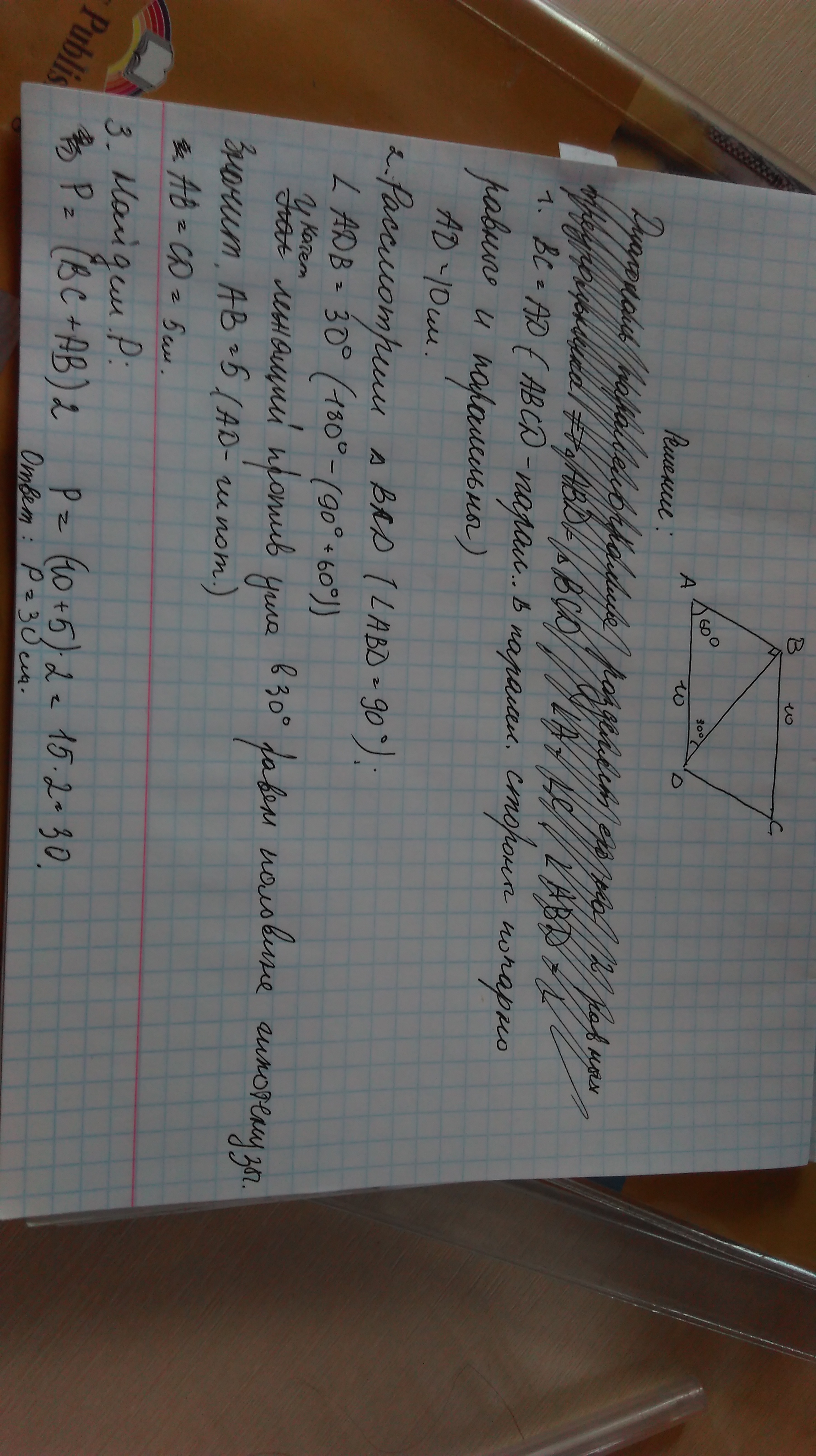 в параллелограмме ABCD угол A равен 60 градусов , BC = 10, BD ⊥ AB. Найти периметр параллелограмма.