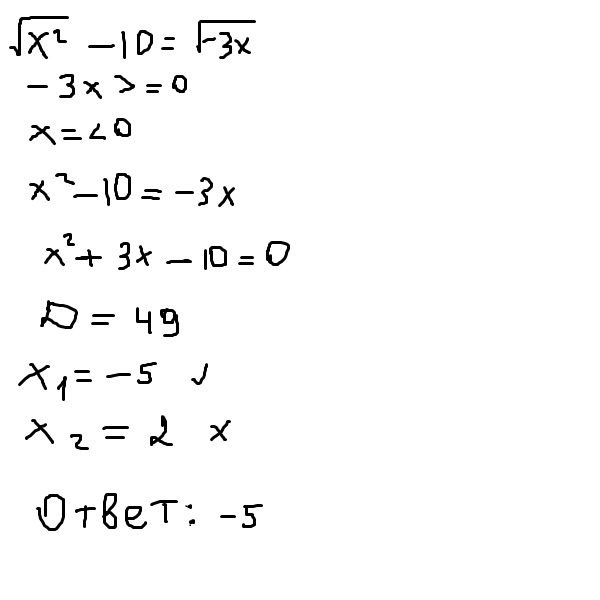 Найдём первым делом ОДЗ из первого корня следует,что х>=0, а из второго, что -3х>=0,учитывая оба имеем, что х=0,но подстановкой убеждаемся, что 0-10не равно 0,значит, нет корней