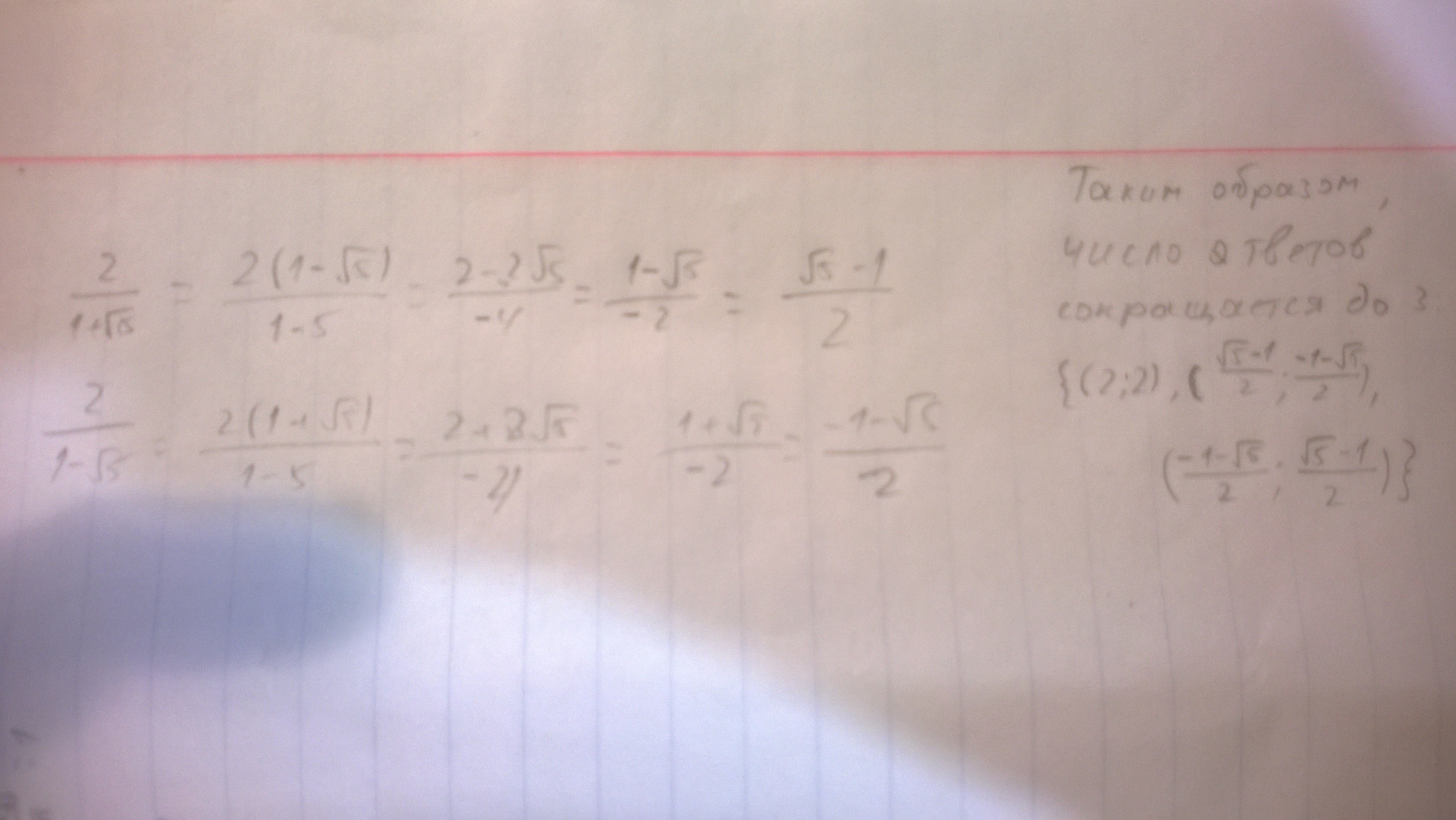 Да, согласен, поспешил, на самом деле ответов 8, но путем удаления одинаковых получается всего лишь 3. Что касается минуса в знаменателе и иррациональности, то нет сложности в том, чтобы привести это к нужному Вам виду. Моей задачей было помочь решить, но не правильно оформить.