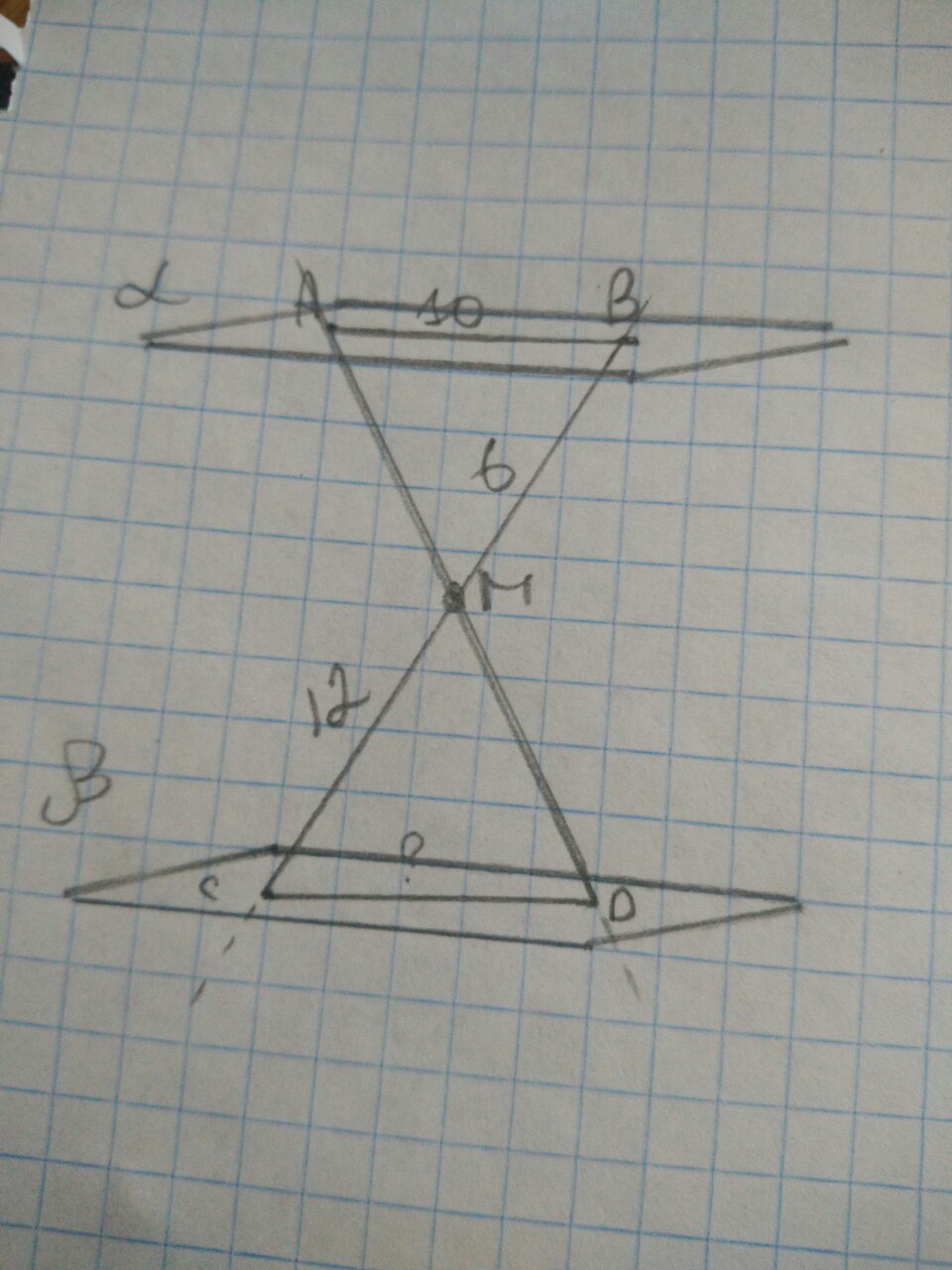Даны две параллельные плоскости α и β. Точки А и В принадлежат плоскости α, точки С и D - в плоскости β. Отрезки AD и ВС пересекаются в точке М, АВ = 10 см, BM = 6 см, CM = 12 см. Найти длину отрезка CD
