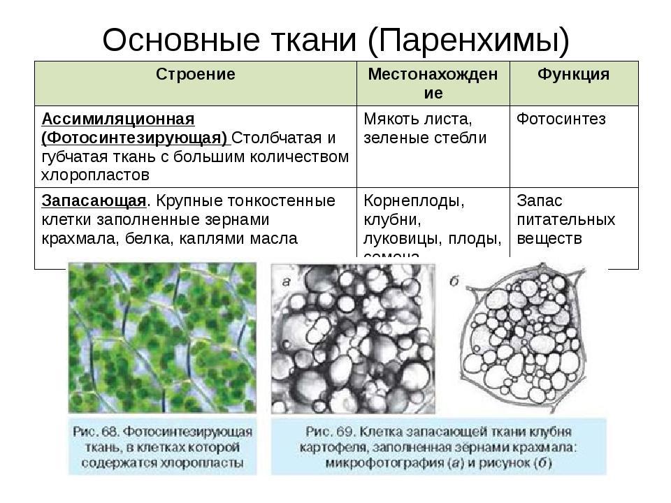 Выделяют фотосинтезирующую основную ткань (содержит хлорофилл), запасающую, воздухоносную, водоносную