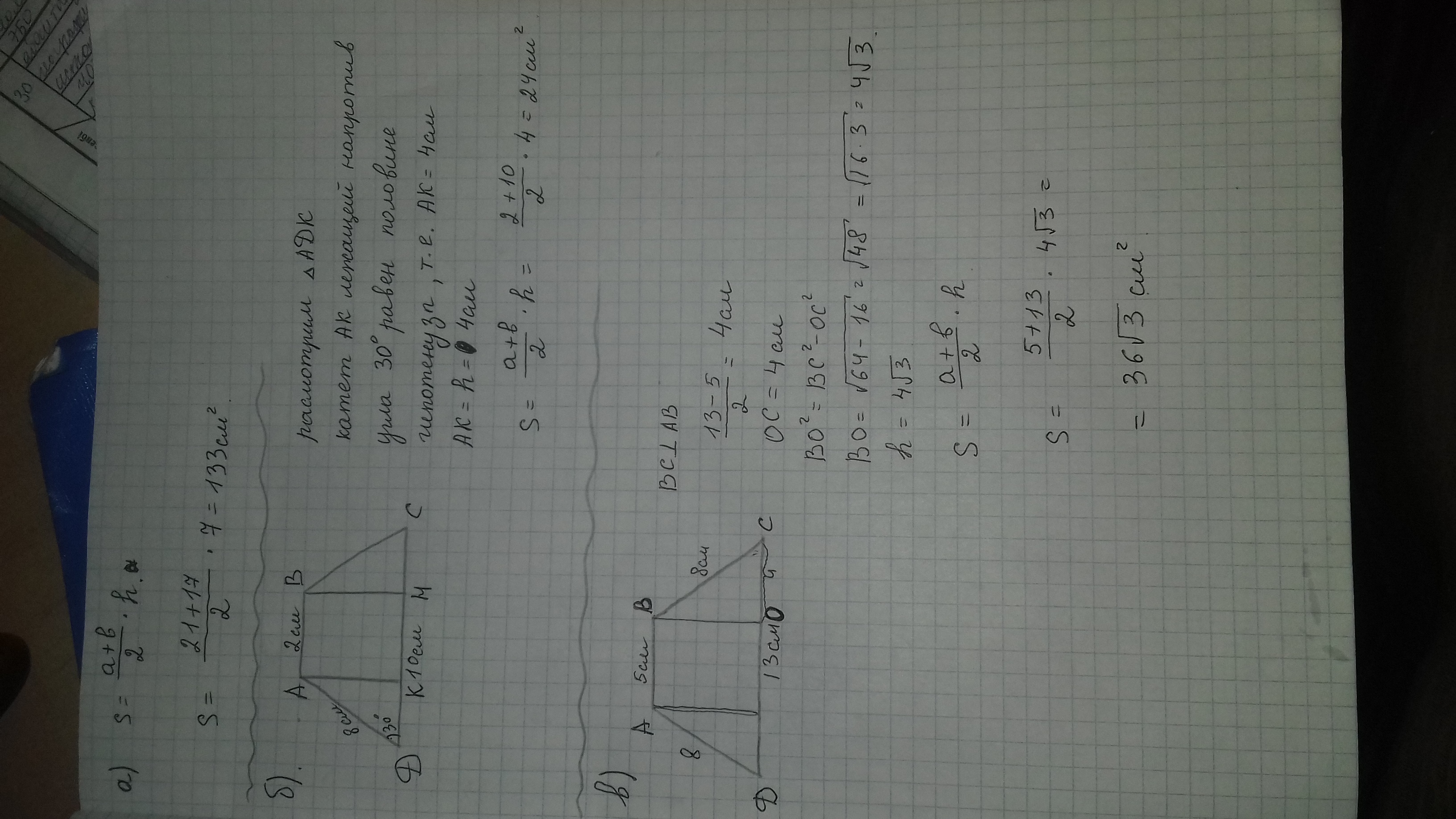 а)S=(a+b)/2*h S=(21+17)/2*7=133