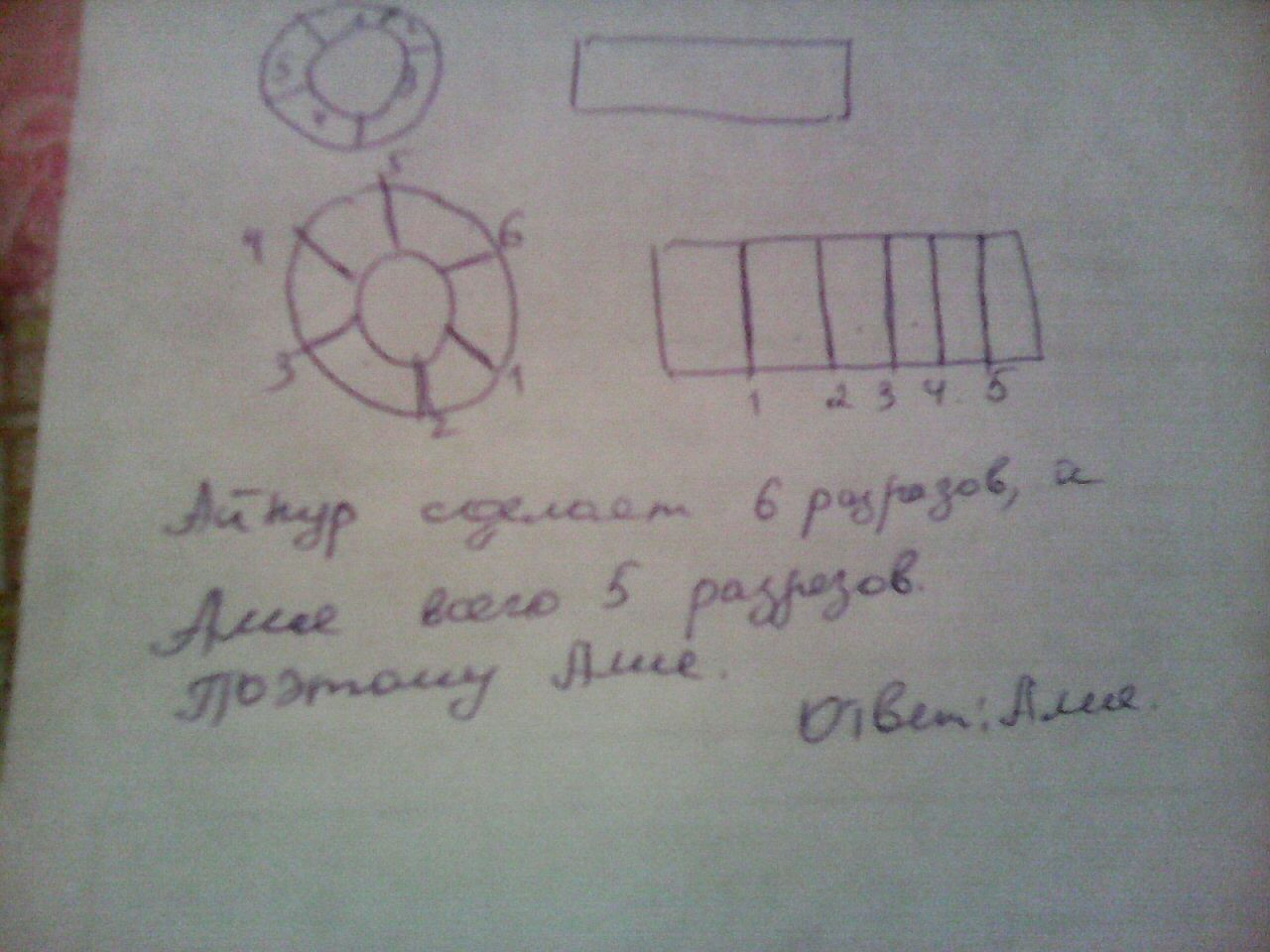 Айнуру нужно сделать 6 разрезов, т.к. он режет бублик, а Алие всего 5 разрезов, т.к. она режет батон. Алия справится с работой быстрее.
