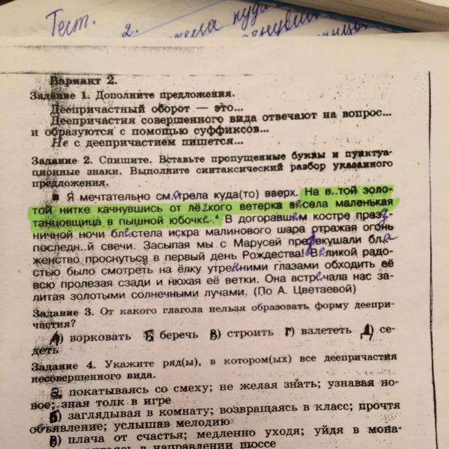 на нитке-дополнение, витой-определение, золотой- определение, качнувшись от лёгкого ветерка-дееприч. оборот, висела- сказуемое, маленькая- определение, танцовщица- дополнение, в юбочке-дополнение, пышной-определение.