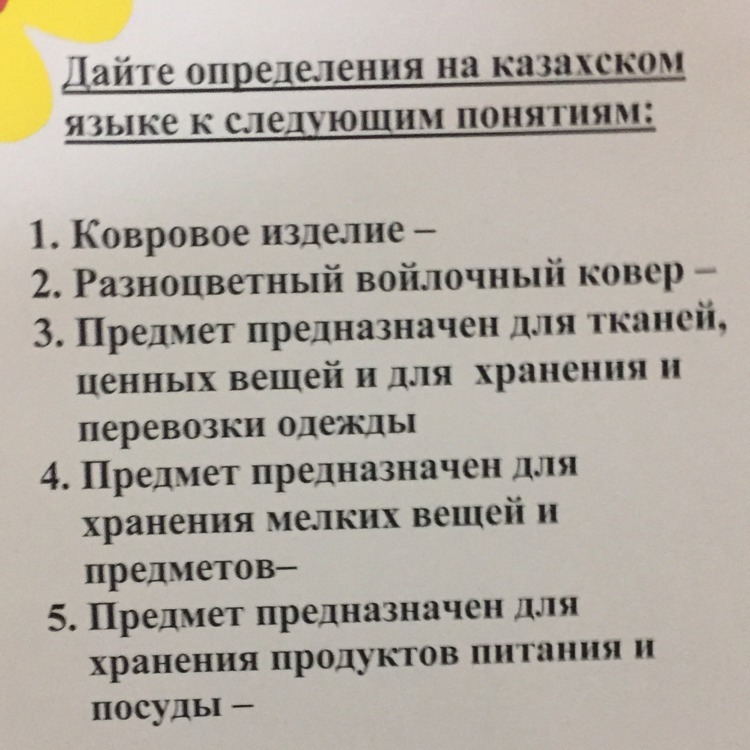 2. Түрлі-түсті жүннен істелген кілем- бұл қазақ халқында жүннен басып істеледі, текемет деп аталады.