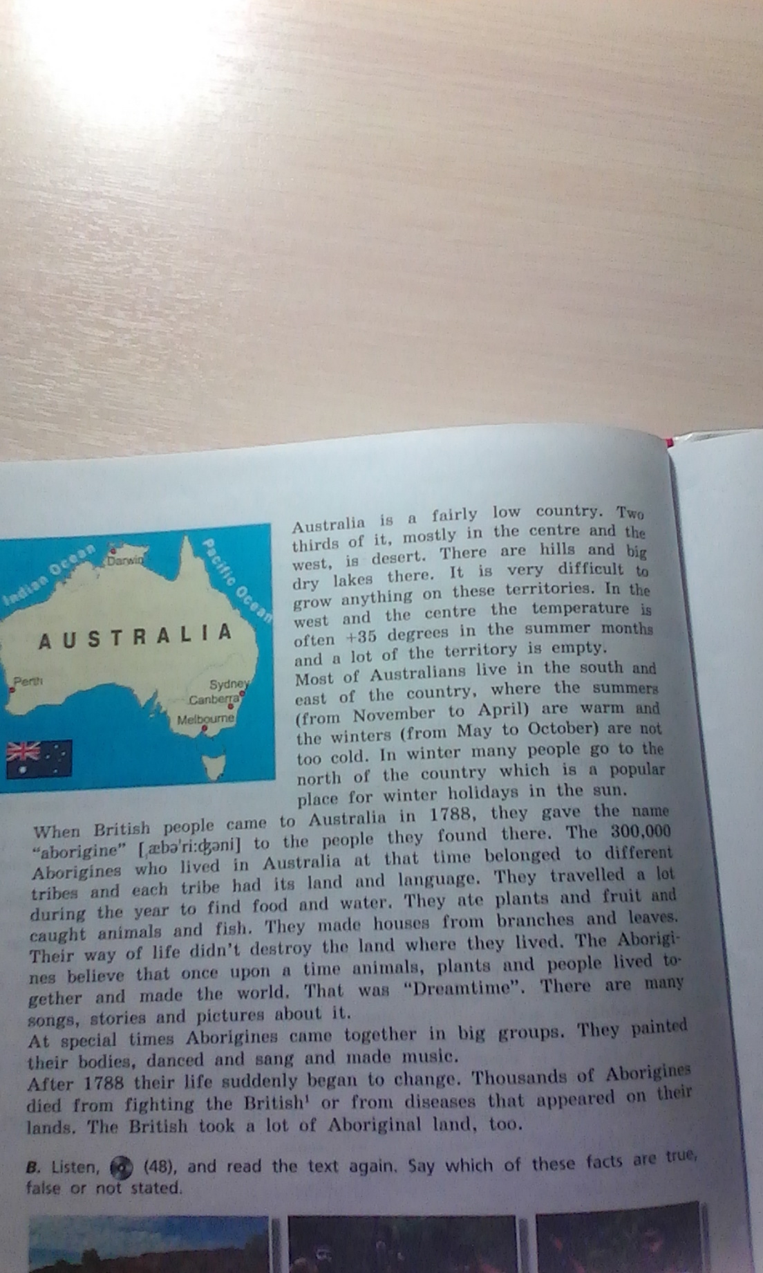 Австралиядовольно низкая страна. Дватрети, в основном в центре и- это пустыня. Есть холмы и большойсухой есть озера, очень трудновыращивать что-либо на этих территориях. Взапад и центр температураградусов в летние месяцымного территории пуст.Большинство австралийцев живет на юге ивостоке страны.где лето(с ноября по апрель) теплая изима (с мая по октябрь) неслишком холодно. Зимой многие люди идут насевер страны, который является популярнымместа для зимнего отдыха на солнце.Когда пришли британцы в Австралию в 1788 году, они дали Мейнабориген (або РИ Дэни) на людей, которых они там нашли.Аборигены, которые жили в Австралии в то время принадлежали к разнымплемена #и у каждого племени были свои земли и языка.за год в поисках пищи и воды, они питались растениями и фруктами, ипойманных животных и рыб. Они мА#г жизни не уничтожить Innd они жили. В Aborigiнэ верю, что однажды животные, растения и люди жили ввместе и сделали мир. Это было *Droamtime. Есть многоПесни, стПС. Они окрашеныих тела, танцевали и пели и исполняли музыку.После 1788 их жизнь вдруг начала меняться. Тысячи аборигеновчто появилосьна ихземли.