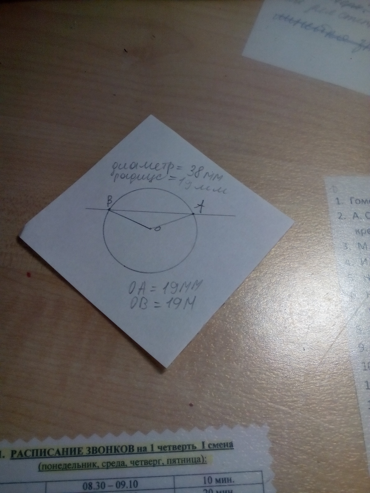 Начерти окружность диаметром 38 мм с центром в точке О проведи прямую так, чтобы она не проходила через центр О но пересекала окружность в двух точках А и В соедини точки с центром окружности какая фигура у тебя получилось измерь стороны и найди периметр этой фигуры даю 20 баллов
