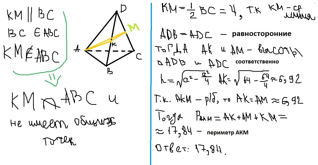 Вычисление периметр треугольника AKM, если расстояние между каждой парой данных точек равно 8см.