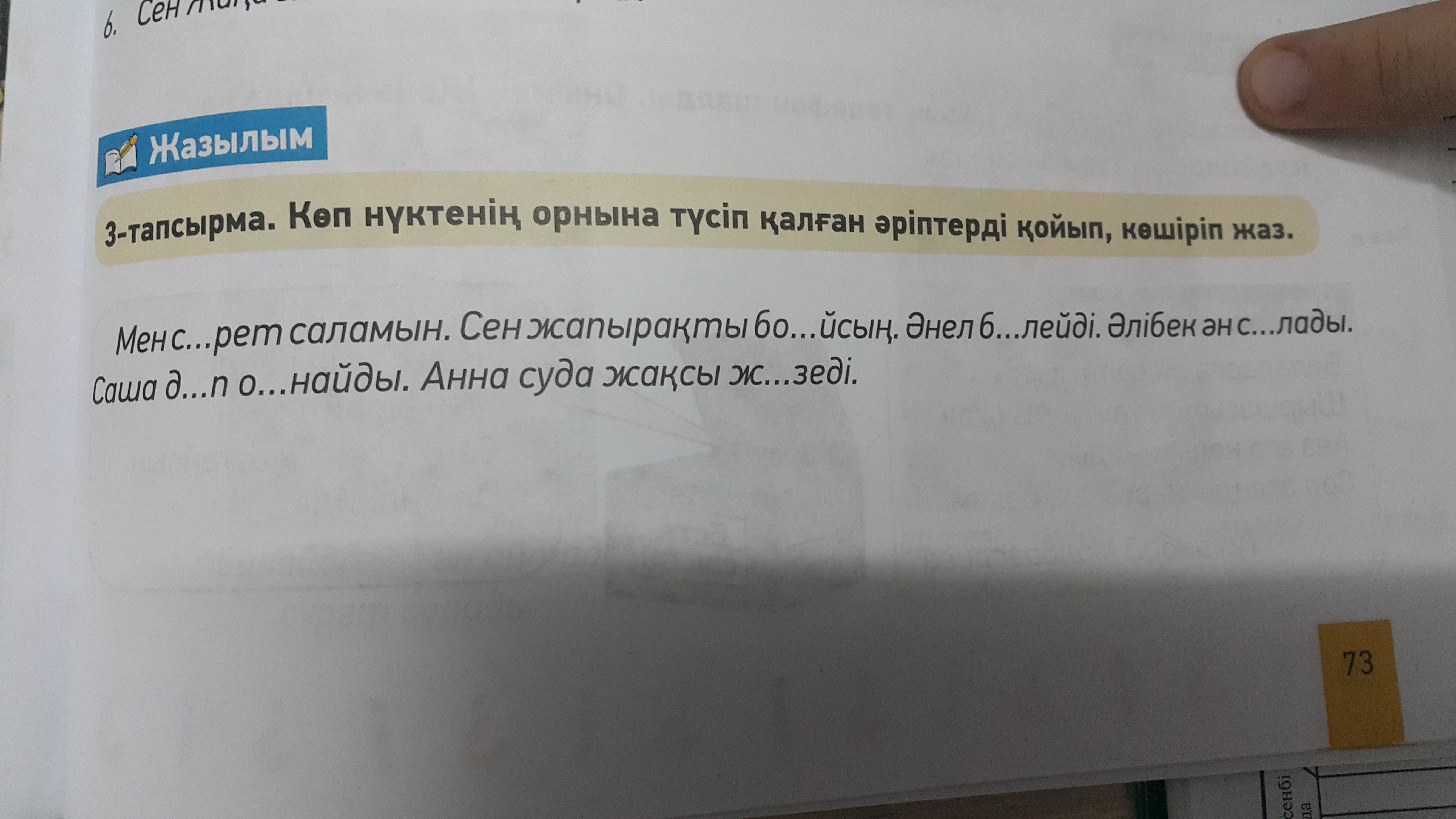 Мен сурет саламын.Сен жапырақты бояйсың.Әнел билейді.Әлібек ән салады.Саша доп ойнайды Анна суда жақсы жүзеді.