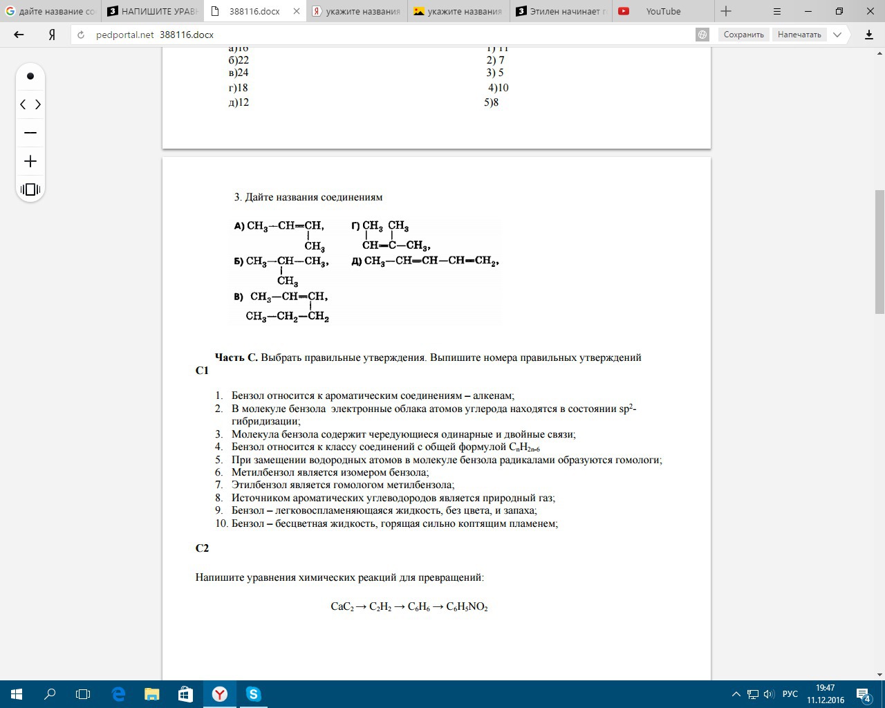 2)3C2H2=>C6H6