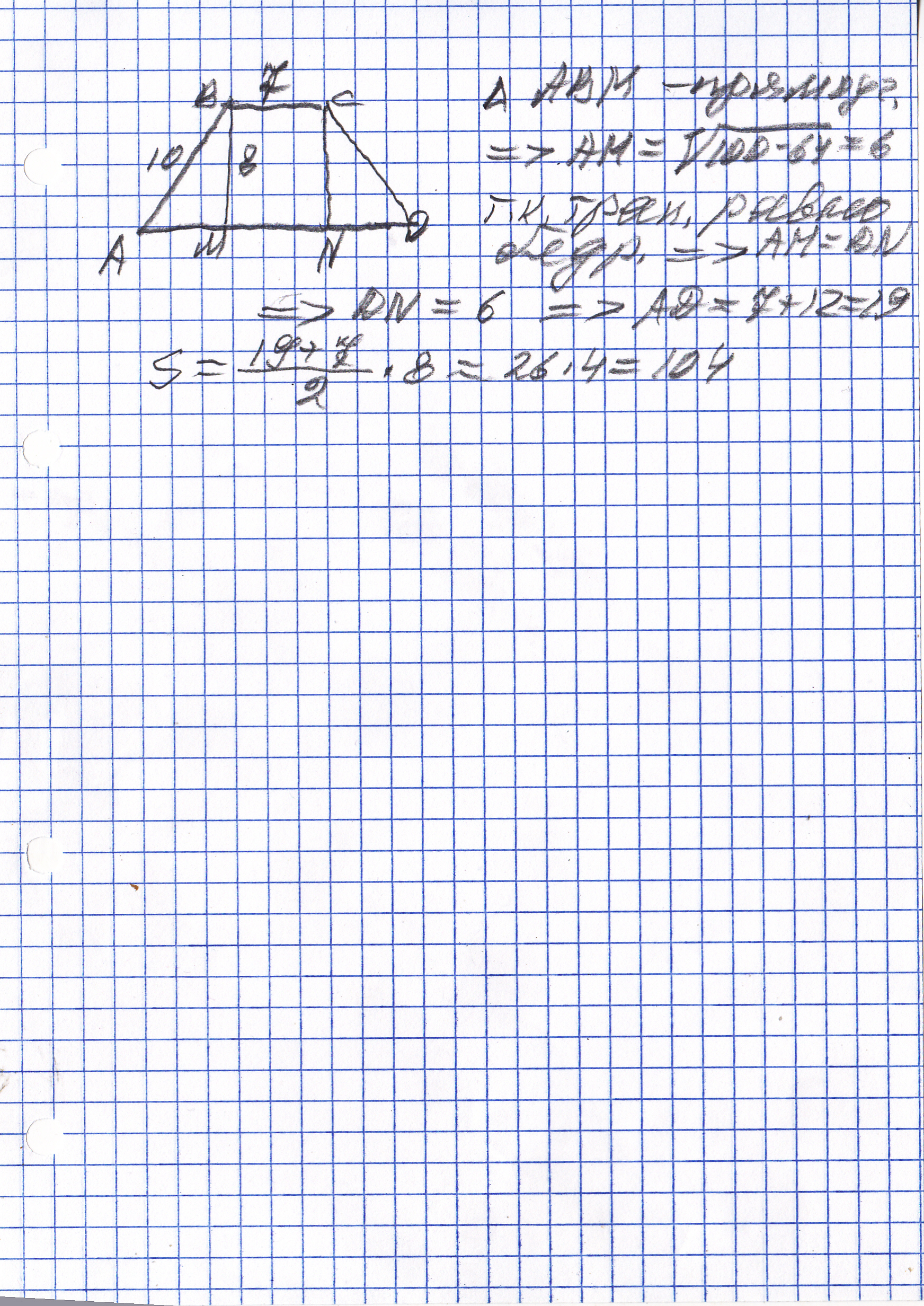 Найдите площадь равнобедренной трапеции, если её меньшее основание равно 7см, боковая сторона равна 10см, высота 8см
