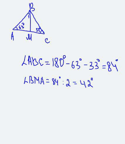 В треугольнике АВС проведена биссектриса ВМ. Найдите величину угла ВМА, если угол ВАС=63*, а. угол ВСА=33*