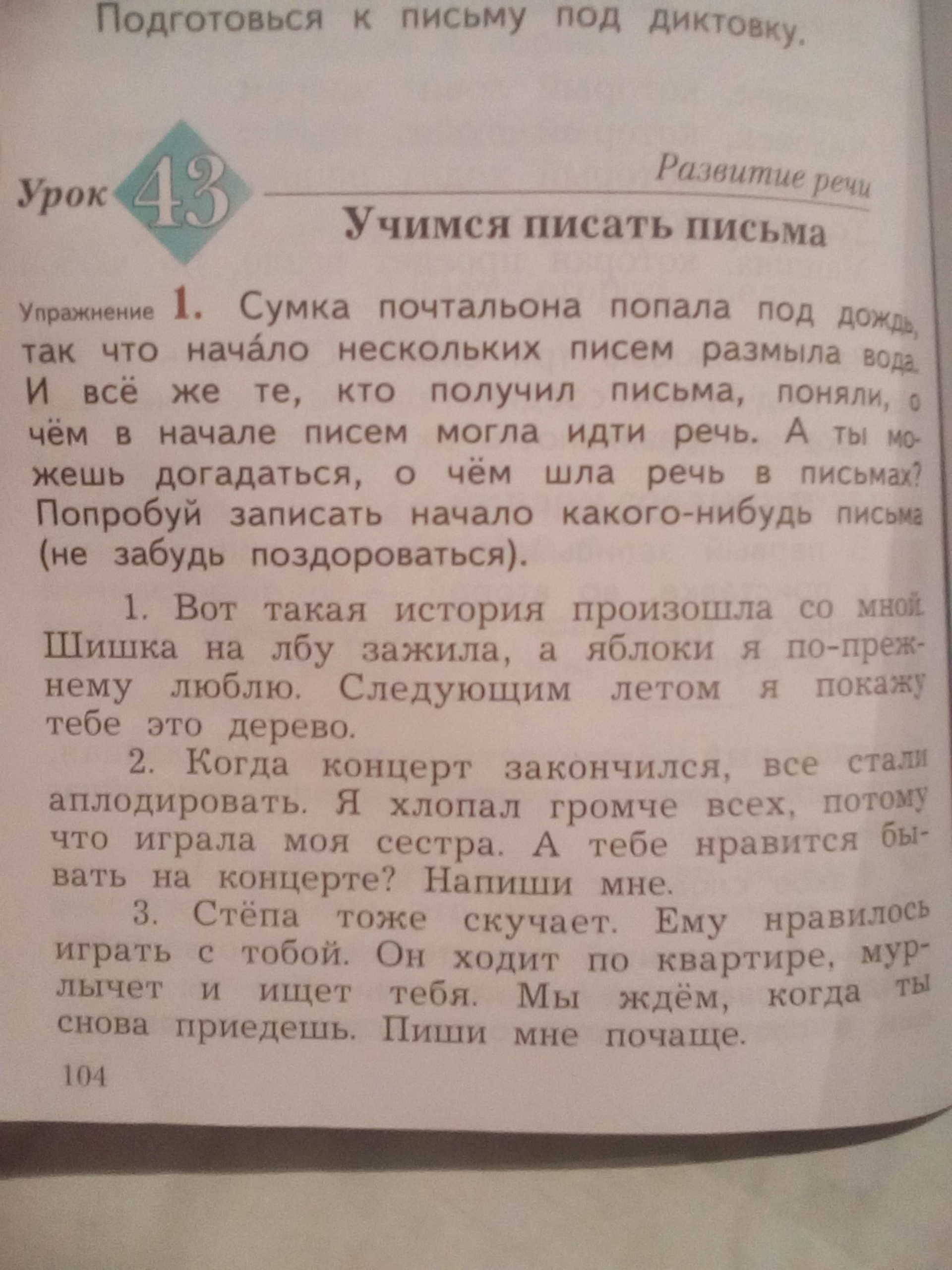 2)Здравствуй. Помнишь, я писал тебе о моей старшей сестре, что она ходит в Музыкальный кружок? Так вот: у них был концерт! В нашем городе, в здании, которое я называю "цветным", я уже рассказывал о нем. Так вот, концертная программа была посвещена дню матери. Я так радовался, когда, наконец, время подошло. Я сидел в зале и слушал песни: они все были красивыми, но самую прекрасную песню спела моя сестра. Она пела про мальчика, который для мамы готов достать солнце, я до сих пор ее помню. Когда концерт закончился, все стали аплодировать. Я хлопал громче всех, потому что играла моя сестра. А тебе нравится бывать на концерте? Напиши мне.