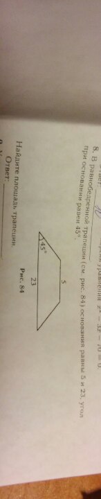 В равнобедренной трапеции основания равны 5 и 23,угол при основании равен 45.Найдите площадь трапеции