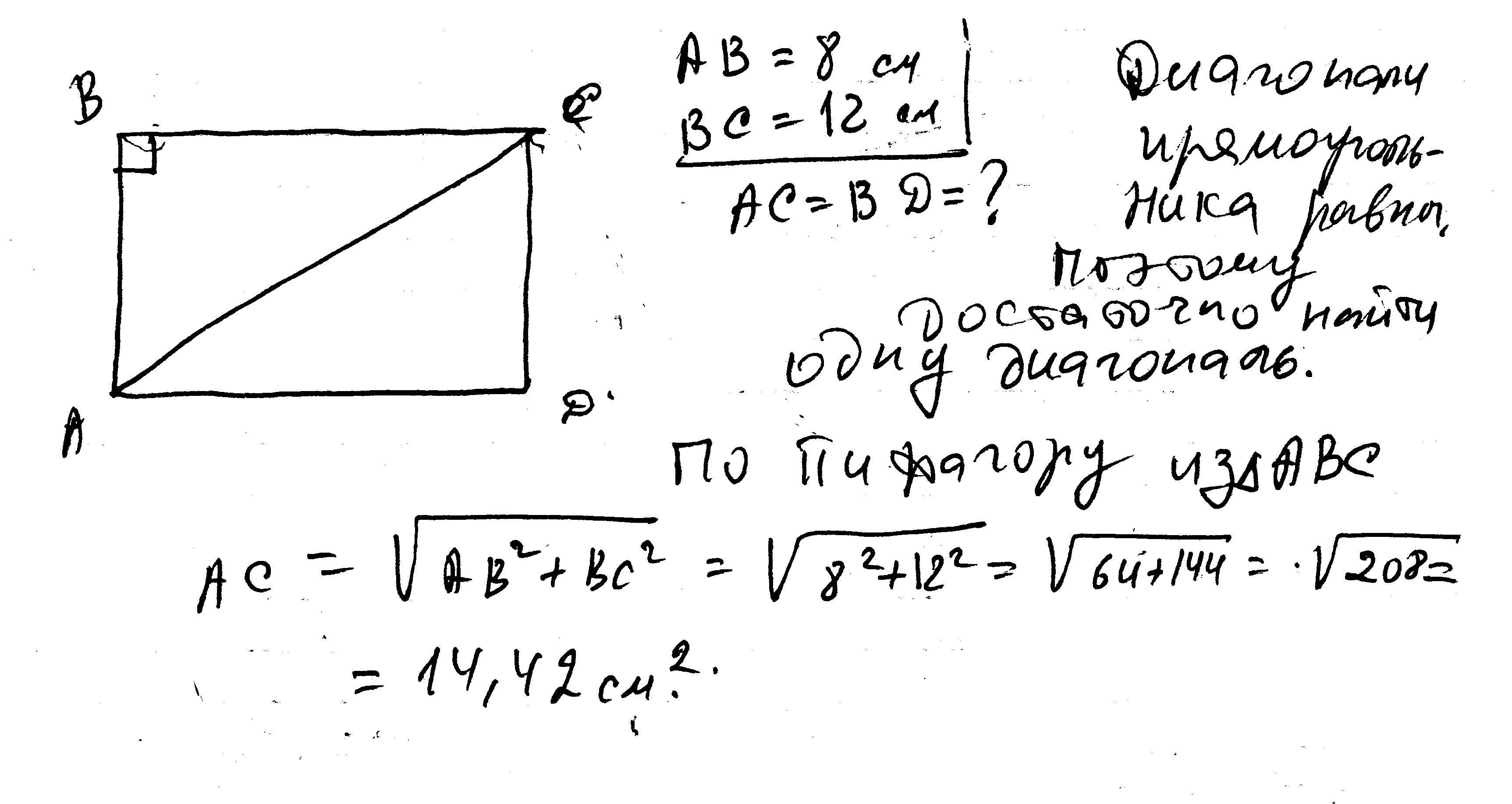 <p>Стороны прямоугольника равны <strong>8 и 12 см</strong>. <strong>Найти его диагонали.</strong></p>