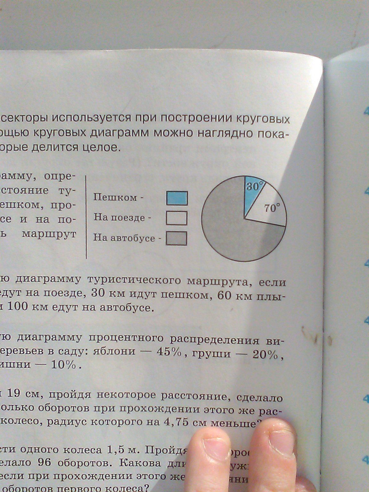 Используя диаграмму, определи, какое расстояние туристы прошли пешком, проехали на автобусе и на поезде, если весь маршрут составил 180 км.