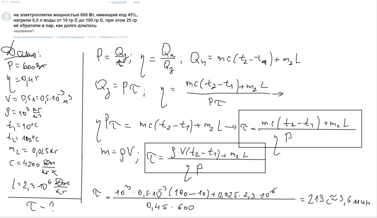 на электроплитке мощностью 600 Вт, имеющий кпд 45%, нагрели 0,5 л воды от 10 гр С до 100 гр С, при этом 25 гр её обратили в пар. как долго длилось нагревание?