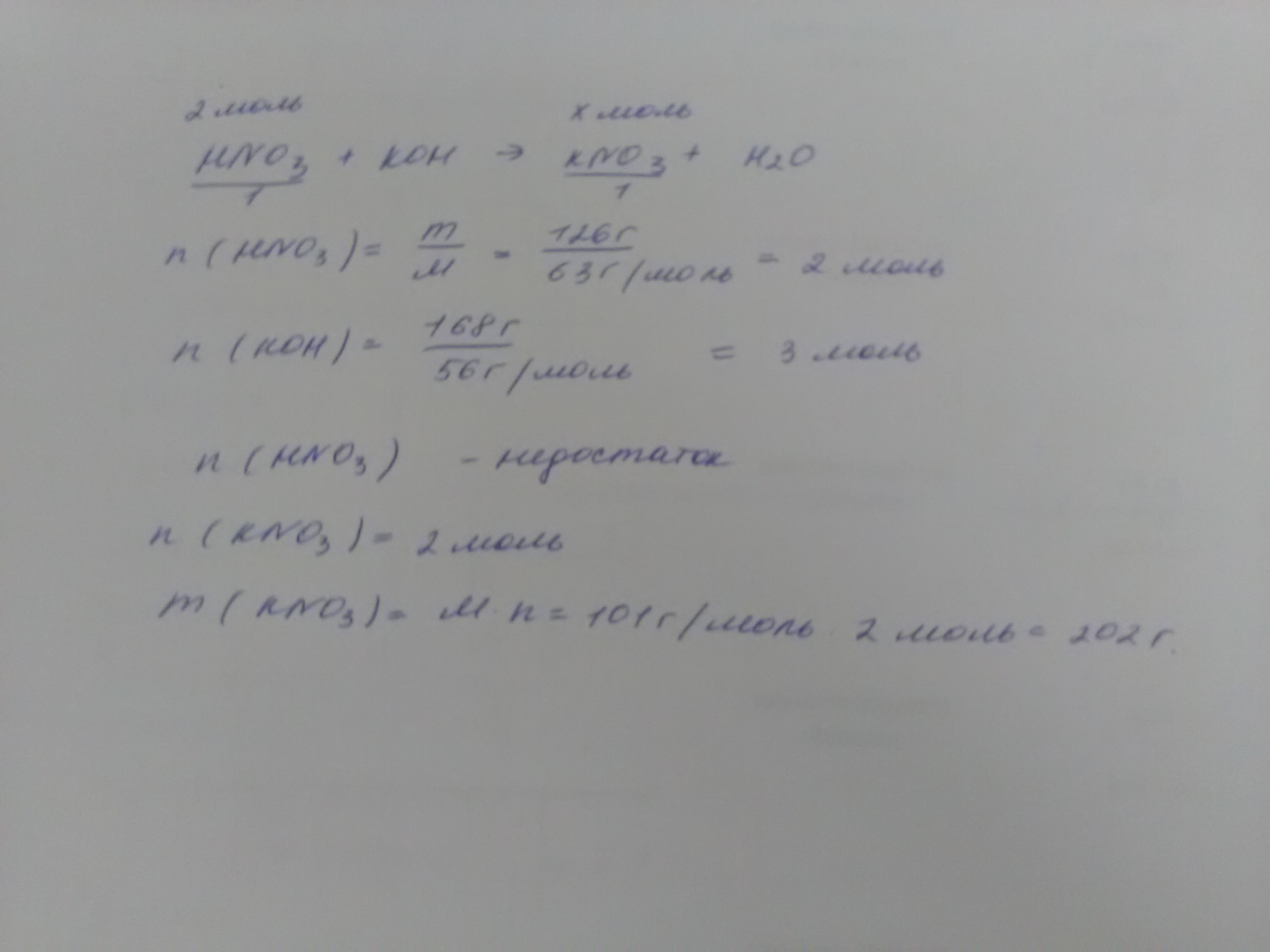 определите массу нитрата калия образуется при взаимодействии азотной кислоты массой 126г с гидроксидом калия массой 168г